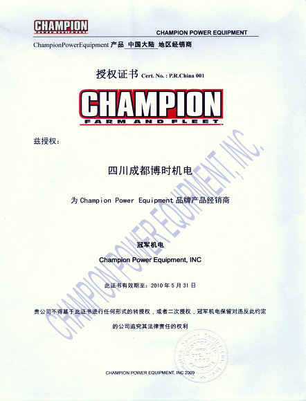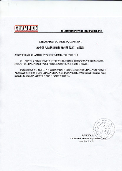 本公司就2009年8月3日在网络出现大量攻击、诽谤美国冠军授权事宜做出再次申明,美国冠军机电在大陆地区独家授权给成都博时机电有限责任公司真实有效,为此,美国冠军机电也针对以上事件发表第二次公告(请看下面的扫描件),请广大关心冠军品牌的用户们认准美国冠军机电加盖有钢印的法律文件,不要让有目的、有预谋的造谣和诽谤者来扰乱我们的经营次序和环境。