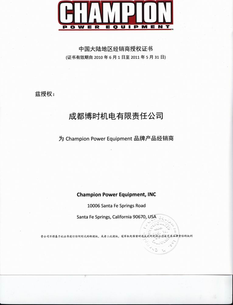 美国冠军公司2010年授权书